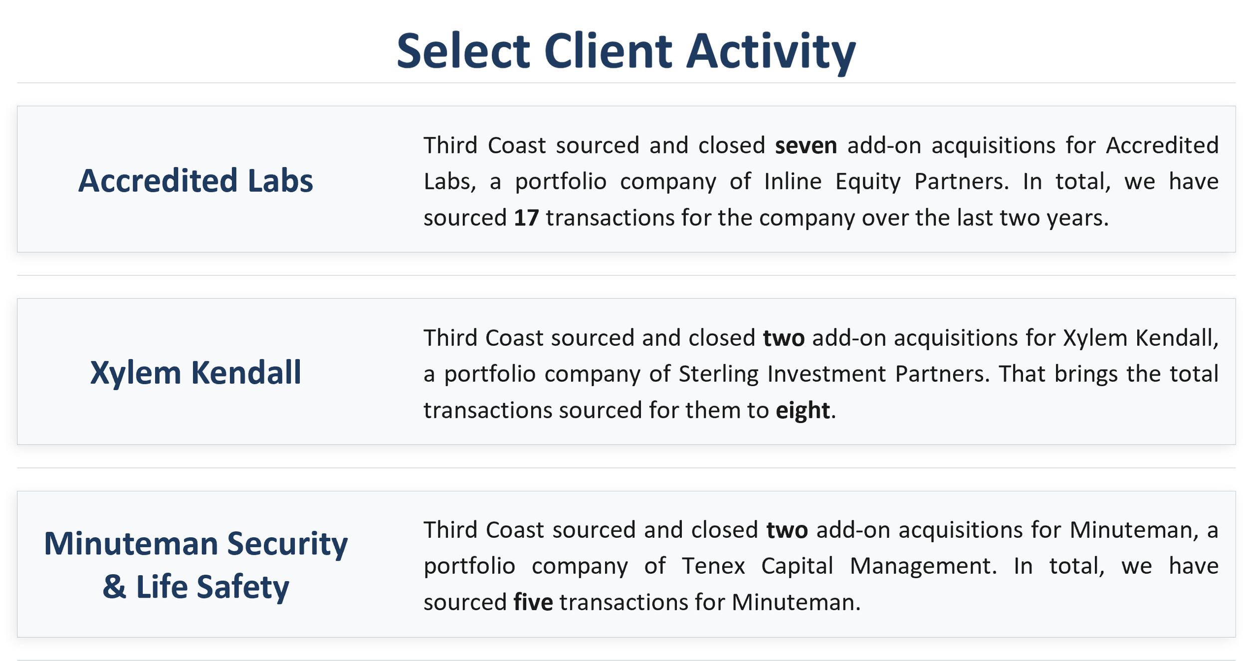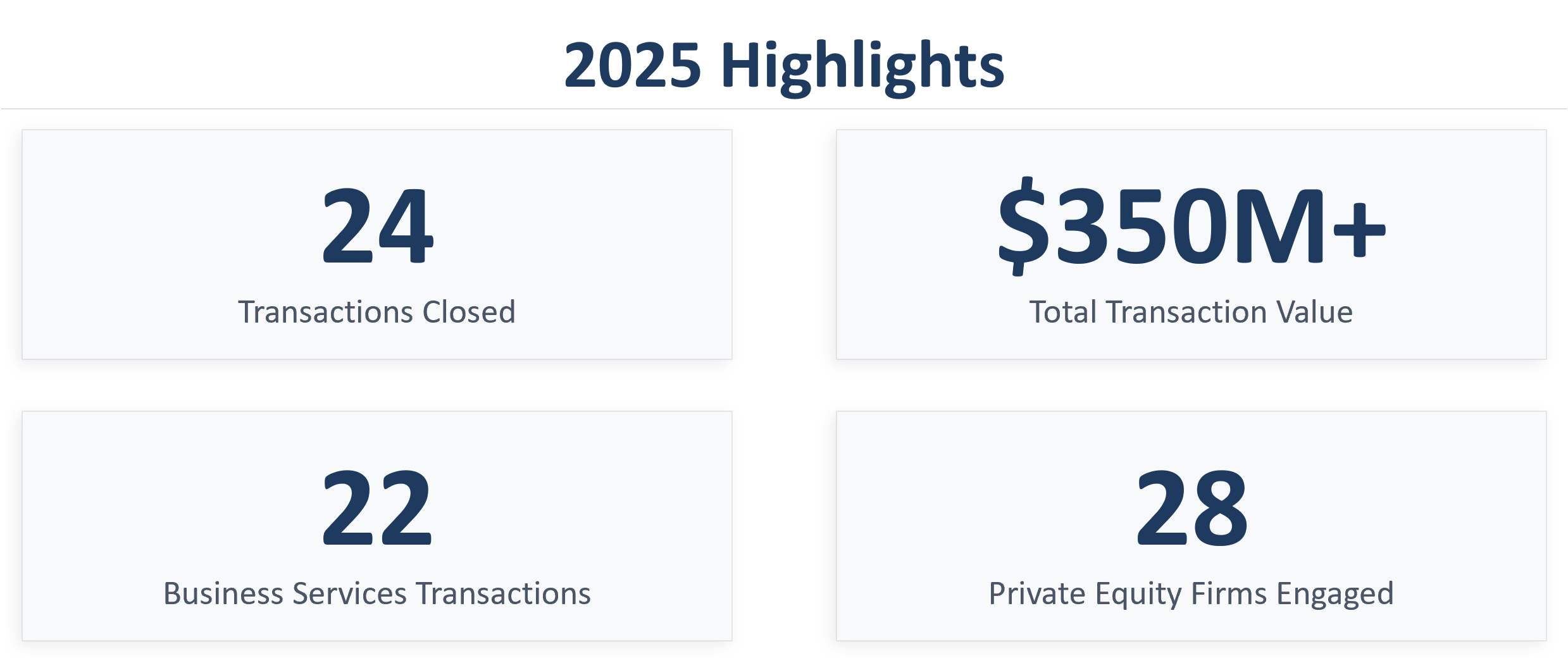 We had busy year closing add-on acquisitions for the portfolio companies of Private Equity firms. We are grateful for our valued sponsor relationships and look forward to partnering with you again in 2026!